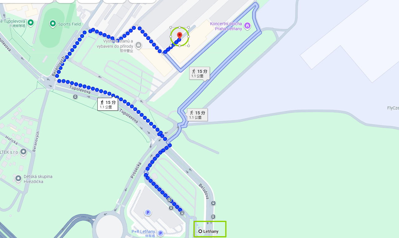 Letňany (metro C) + approx. 15 min walk